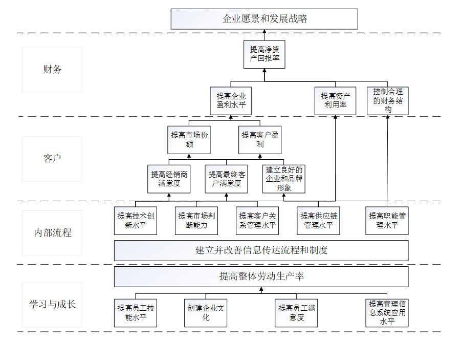 (4)具有良好基礎管理水平的企業(yè)。平衡計分卡在企業(yè)得以適用的前提之一是企業(yè)對自身生產經營管理各項工作建立了分工明確,職責鮮明的管理系統(tǒng),即擁有良好的基礎管理水平而不是管理混亂、職責模糊缺乏有效分工。所謂的企業(yè)基礎管理水平設計企業(yè)生產經營管理全流程的管理權責體系及流程設計,包括企業(yè)生產經營所涉及的戰(zhàn)略、質量、生產、采購、工程項目、營銷、財務、人力資源等各項管理工作。